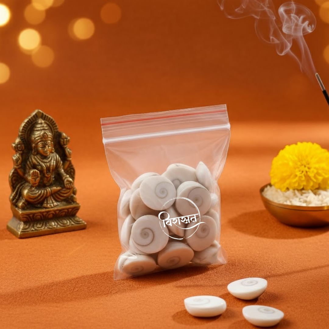 According to Vedic scriptures, Gomti Chakras are symbols of Goddess Lakshmi (wealth) and Lord Vishnu (protection). Keeping or worshipping them at home, office, or temple is believed to attract abundance, success, and positive energy while removing financial blockages and evil influences.